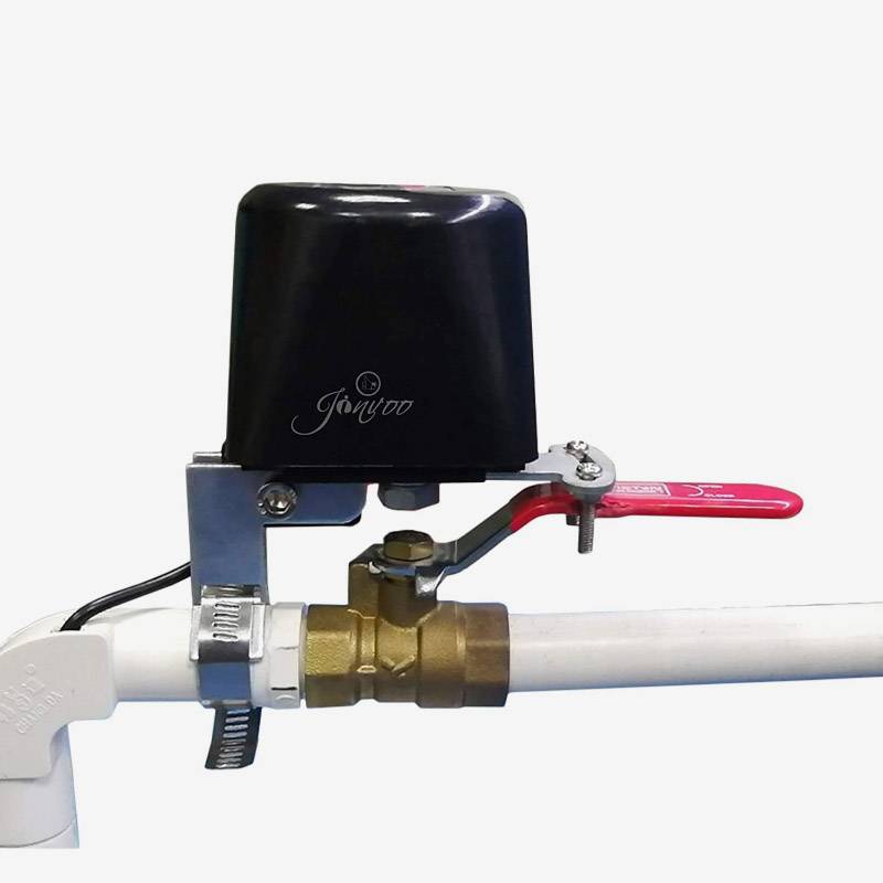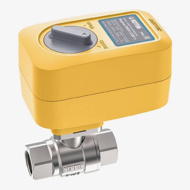 - Шаровой кран с электроприводом — это электрический кран, который ставится в разрез трубы. Это надежно, но сам кран дороже, а еще потребуется помощь сантехника.